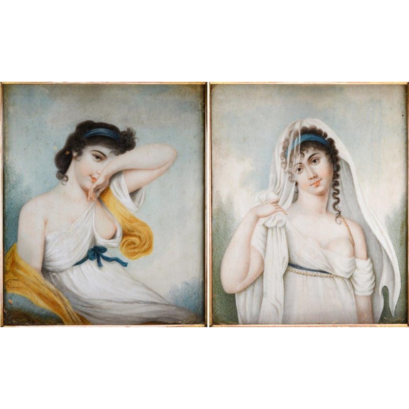 Portrait of a lady (after Reynolds' "The Snake In The Grass"), on ivory, 11.5 x 9.5 cms, gilt frame with another similar, probably French School, of a lady with a veil; 11.5 x 9.5 cms (2)