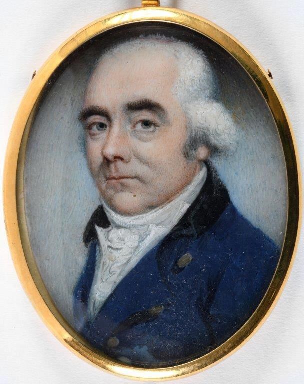 ENGLISH SCHOOL c.1800 Miniature portrait of a gentleman wearing blue jacket, head & shoulders, on ivory, 6 x 4.5 cms