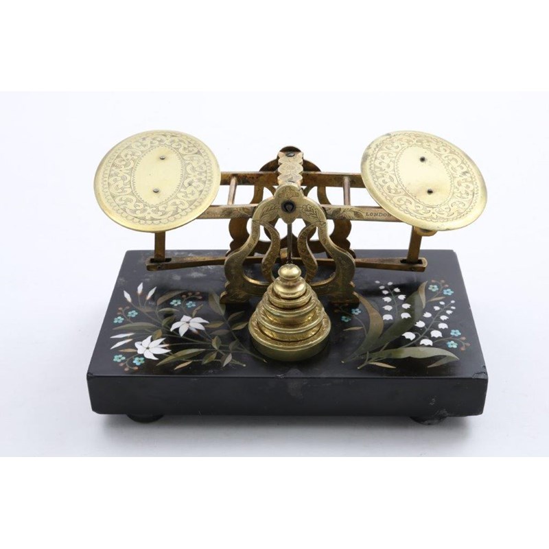 A SET OF VICTORIAN LETTER SCALES by S. Mordan and Co., engraved brass with weights on inlaid pietra dura base