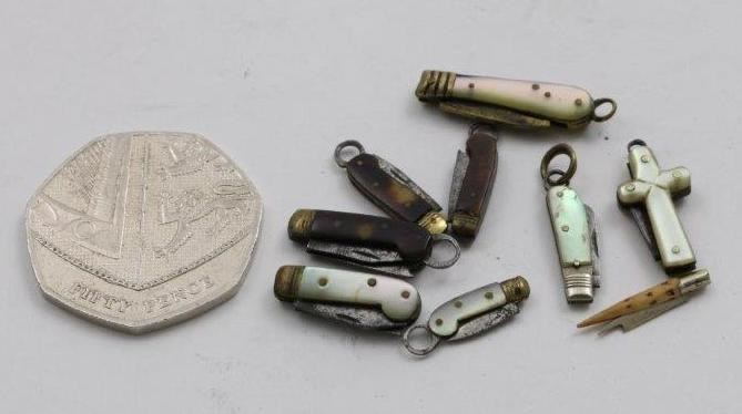 MINIATURE POCKET KNIVES Nine various including eight mother of pearl or tortoiseshell examples, one shaped as a cross, average 1.5 cms (9)