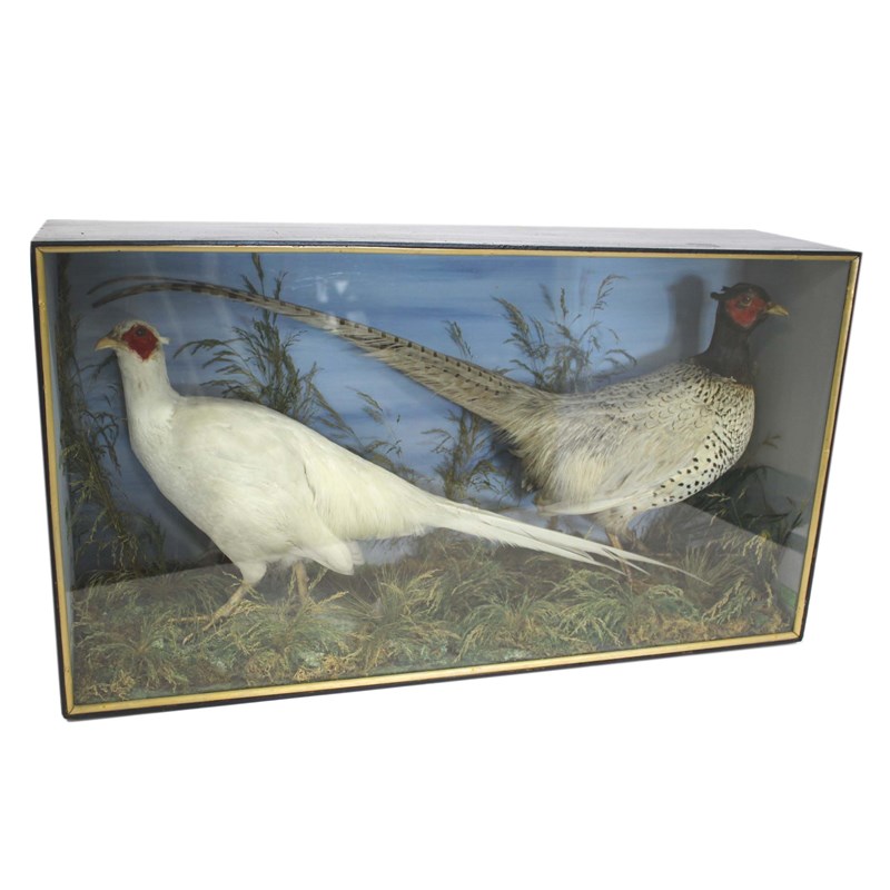 a pair of White Pheasants in a naturalistic background, and mounted in a wooden and glazed case. With a label inside for Grant & Son, Bird & Animal Preserves, Devizes, Prize Medal 1870. Case 79cms across