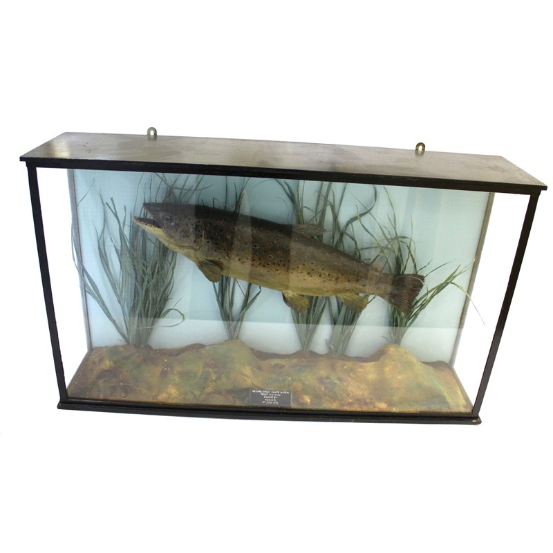 a stuffed Trout, mounted in a naturalistic background and in a wooden and glazed case. With a plaque inside, Record Dipley (White Water) Trout 3lb (4ozs), Caught by H.J.C D-H, 1st June 1972. Case 72cms across