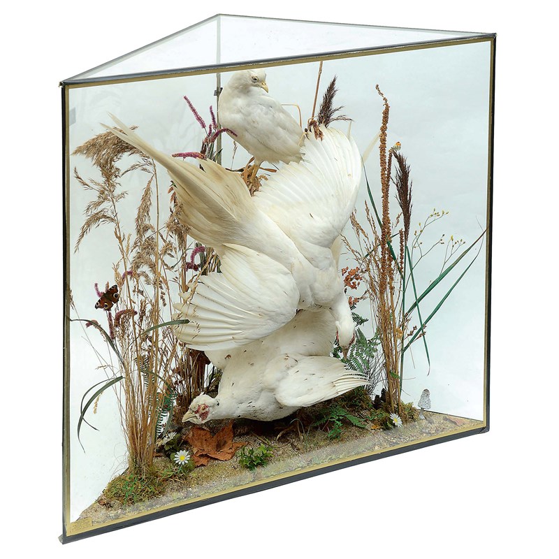3 white Pheasants mounted in a naturalistic background, in an interesting corner shaped glazed case. With a label for Edward A Sadler, (Naturama), Andover, Hampshire, Taxidermist and Naturalist. Case 90cms high
