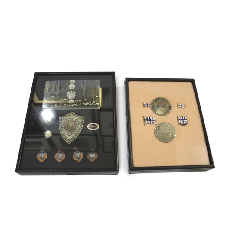 including a cased set of medals including the 1955 Sea Angling Festival (Hastings & St Leonards) Folkestone Sea Angling Association, East Hastings etc. Also with another case containing National Federation of Anglers National Angling Championship medals, and some small fishing badges. (2)