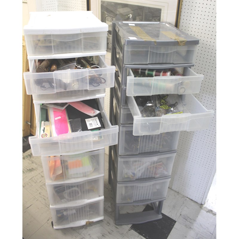 a variety of accessories stored in two upright sets of plastic drawers. Including various priest's with wooden and horn handles, reels of thread, various feathers still in their packets (Veniard, Celtic Flycraft, Allcock etc), floating yarn, House of Hardy Salmon Priest (in it's packet), Hardy Fly Wallet, House of Hardy Thermometer, fly line, and various other items.