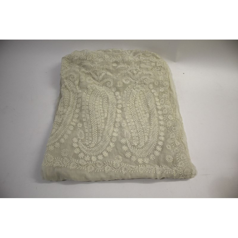 various lace including an Irish crochet lace jacket, a lace shawl, a large lace garment (possibly part of a Veil), a large length of lace, embroidered white work stole with boteh design, lace petticoat skirt, collar and other fragments.