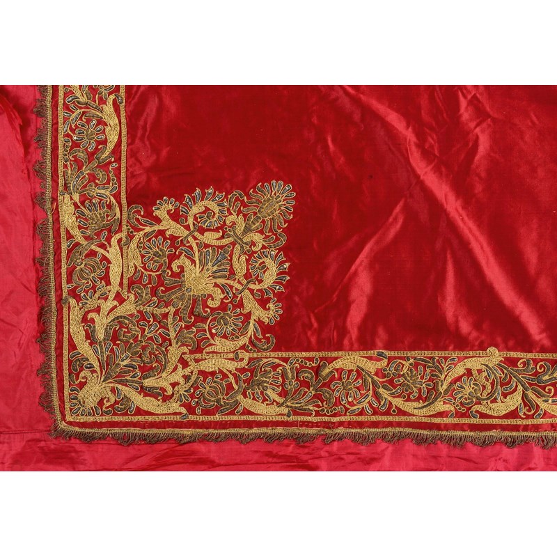 a late 17th/early 18thc crimson silk bed cover, decorated with an elaborate border of raised gold and silver coloured metallic embroidery and fringing. Possibly Indian of Persian. 230cms by 217cms