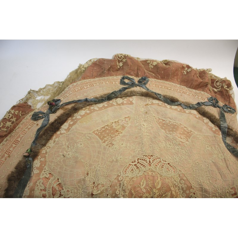 PAIR OF SILK & LACE BED HANGINGS probably 19thc, pink silk overlaid with lace and with silk ribbons and raised embroidered flowers.