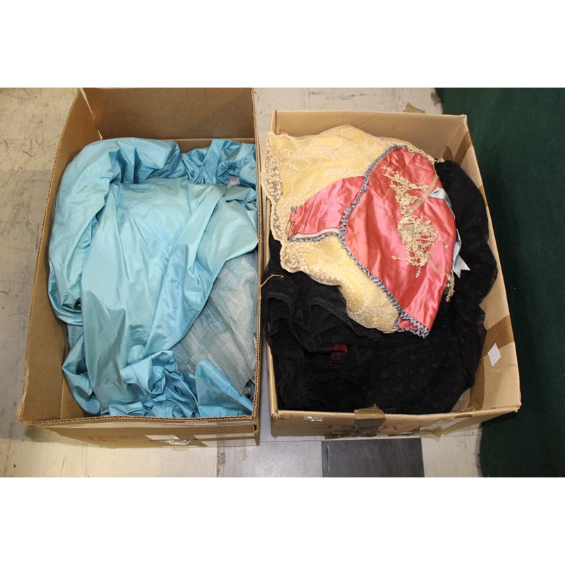 including a 19thc mourning cape edged with lace, a black lace shawl, a Louis Feraud black lace and taffeta evening dress, a Victor Stiebel ball gown in blue silk, and various other items.