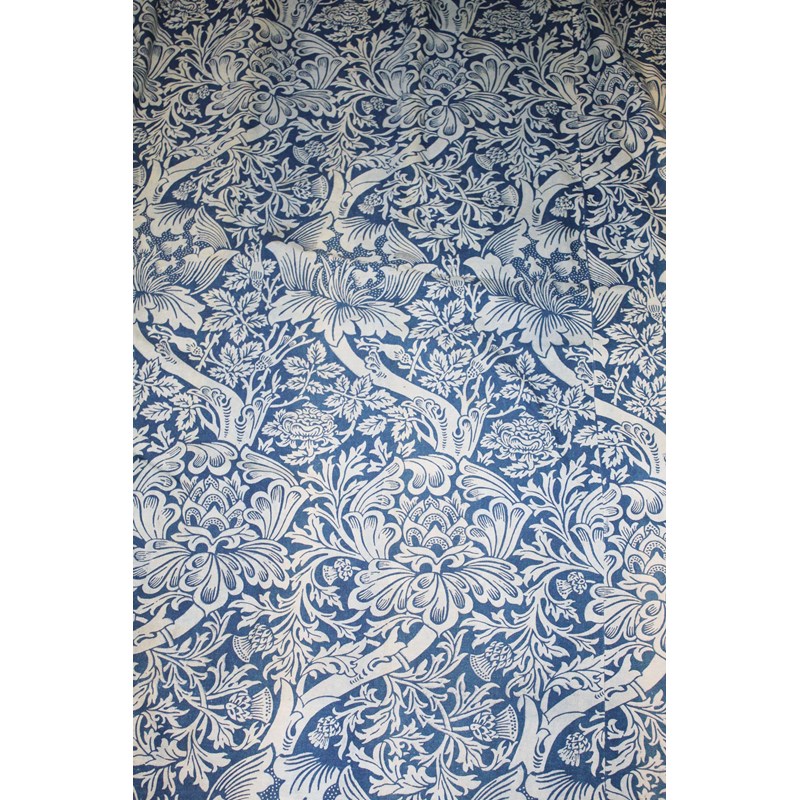 two pairs of Indigo block printed curtains, one pair lined with borage William Morris print and with a pair of tie backs. Curtains faded in places, with a label on one for Morris & Co, Decorators, Upholsterers, and Church Furnishers, 449 Oxford St, London (this label was used from 1882-1917). 2.4m width (125cms) one pair, 2.4m (130cms) width for the other pair.