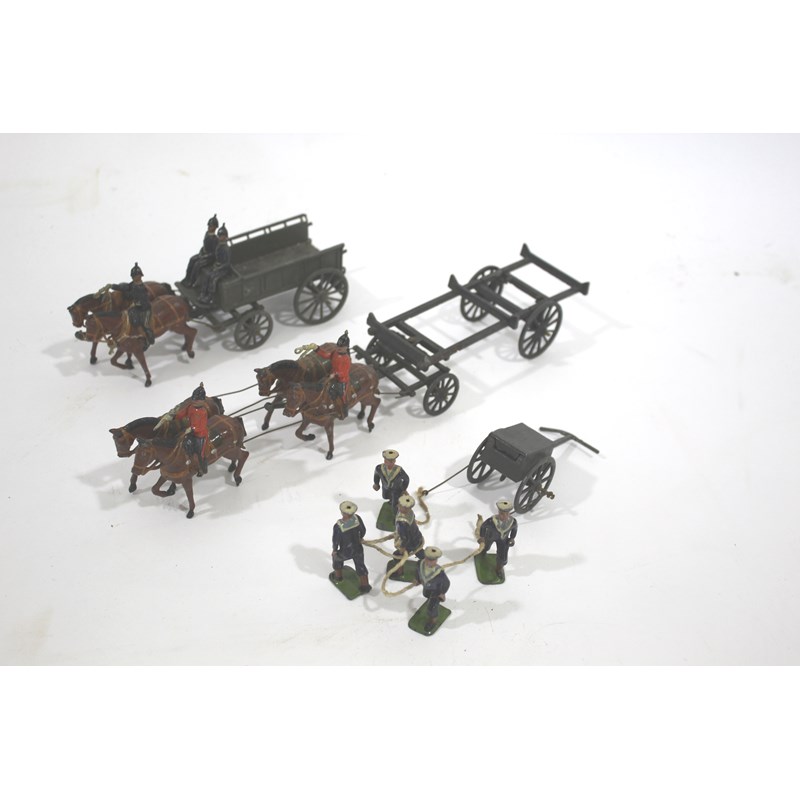 including a Britains Army Service Corps Wagon (Set 146) circa 1906, and a Britains Pontoon Wagon (Set 203) circa 1920. Also with a set of 5 Naval figures 'Bluejackets' landing party (unmarked but probably Britains) pulling a carriage. All items unboxed. (3)