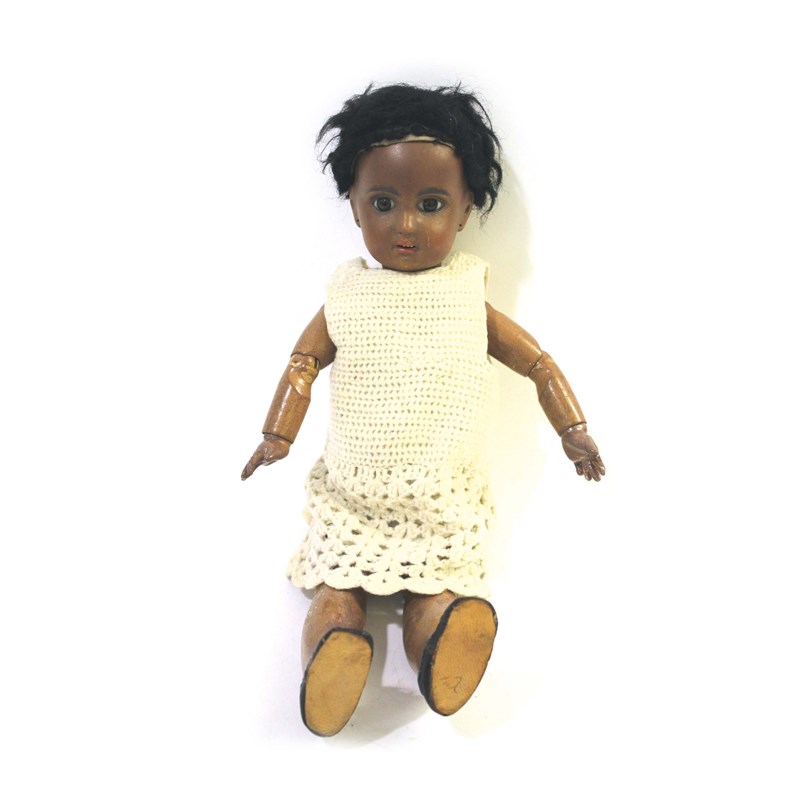 BISQUE HEAD BLACK DOLL probably by Jumeau, with fixed brown eyes, open mouth and pierced ears. Marked, 1907, 4. 13 1/2ins (34cms) high