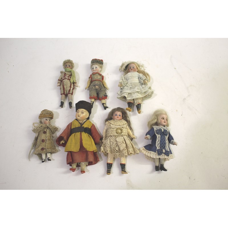 7 various miniature bisque head dolls, including an oriental doll in costume (some damage), and 6 other dolls some in original costumes. (7)