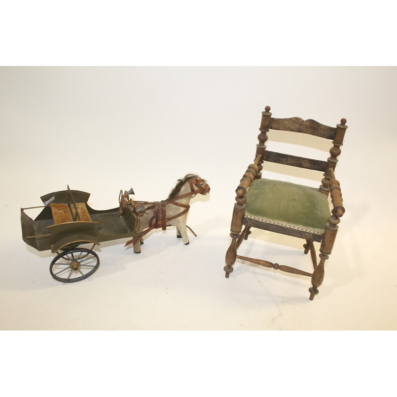 a wooden dolls chair with an upholstered seat, also with a pull along toy Horse & Cart, the horse with animal hair covering. (2)