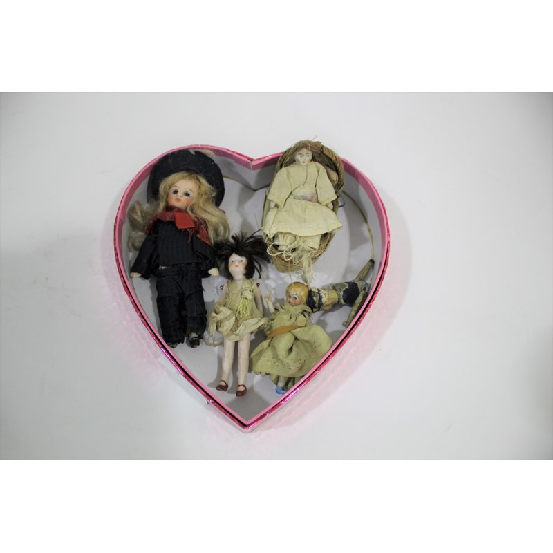 MIGNON DOLL & MINIATURE DOLLS including a Mignon miniature doll, 3 miniature china head dolls with one in a crib and one other item.