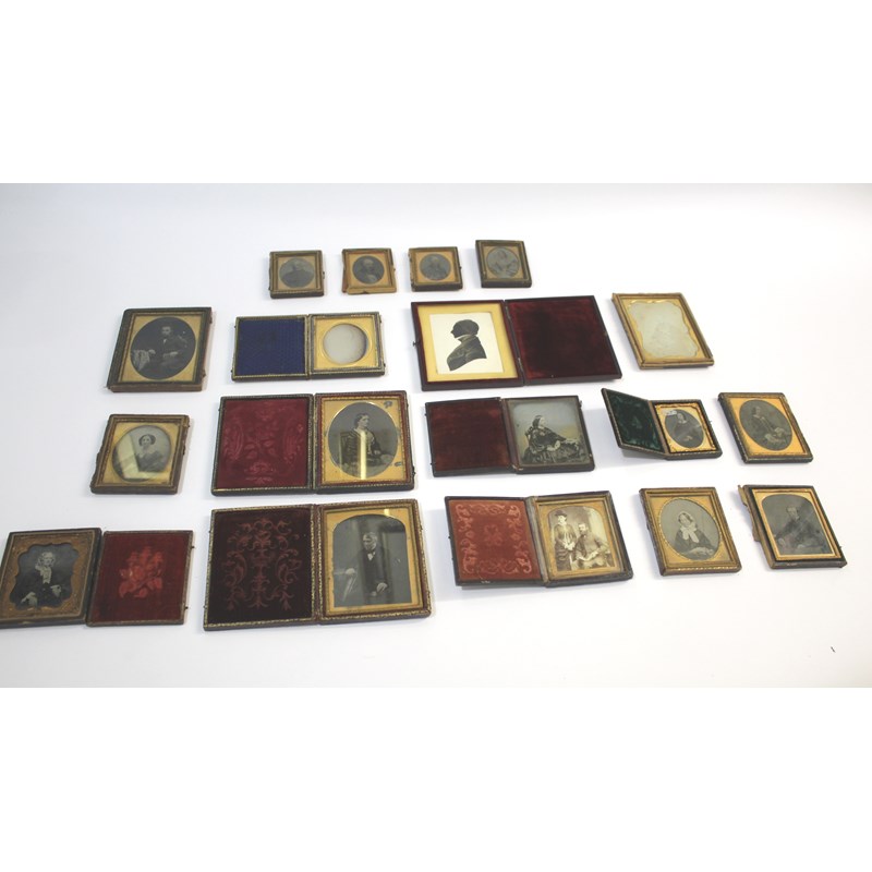 a qty of cased and partially cased Daguerreotypes, mostly individual portrait photographs. Two with makers names, Mansfield & Yeates Dublin, and Jackoletts, Dublin. Also with a cased 19thc Silhouette.