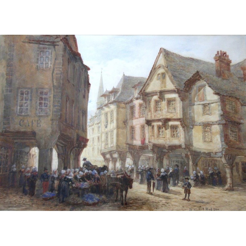 SAMUEL JOHN HODSON, RWS (1836-1908) MARKET DAY IN AN OLD FRENCH TOWN Signed, watercolour 38.5 x 54cm.