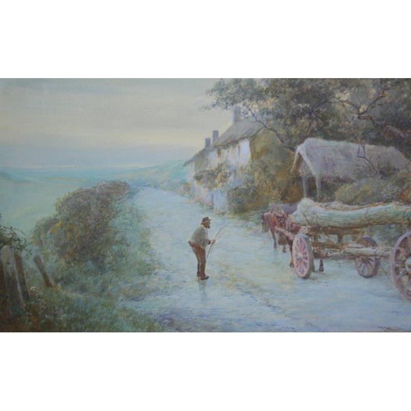 JOHN WHITE (1851-1933) THE TIMBER WAGGON: A HALT BY THE WAY, BRANSCOMBE Signed, bears title on label on the backboard, watercolour and bodycolour 27 x 43.5cm.
