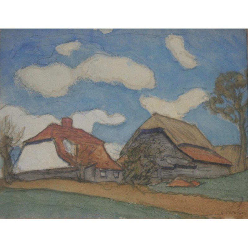 ‡SIR GEORGE CLAUSEN, RA, RWS (1852-1944) FARM BUILDINGS, SPRING MORNING Signed, also signed and inscribed on a label on the backboard, watercolour and pencil 21.5 x 28cm.