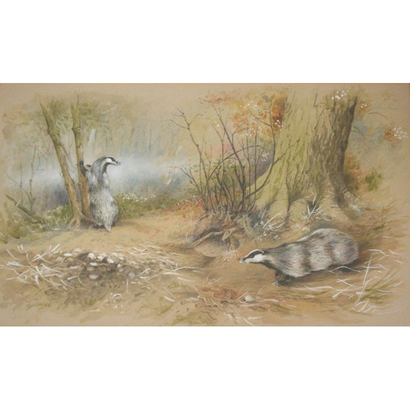 GORDON BENINGFIELD (1936-1998) BADGERS IN A WOOD Signed, watercolour and bodycolour 41 x 69cm. Provenance: London, The Moorland Gallery, May 1968