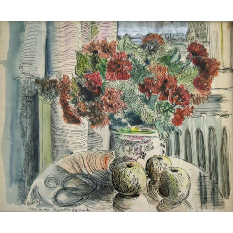 ‡PETER SAMUELSON (1912-1996) CHRYSANTHEMUMS Signed and inscribed Pierre 47/ Pierre Dec.1947 Chrysanthen fr.3.25 per bos [sic], pen and black ink with coloured washes 35.5 x 43.5cm.