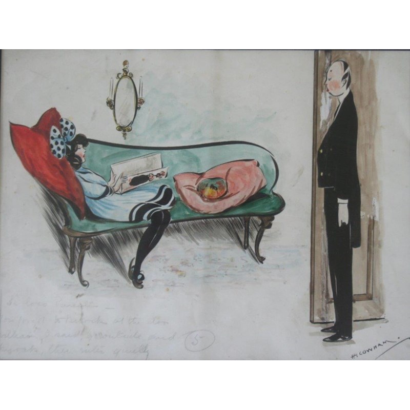 to include works by Max Cowper (of a pretty dancer), 25.5 x 18cm.; Harry Furness (quick ink sketch of Gladstone, 1888), 12.5 x 11.5cm.; Hilda Cowham (`In Loco Parentis`), 18.5 x 24.5cm.; Joseph Skelton (of a couple in a bar), 13.5 x 20cm.; and two further works, initialled EMR and WHAB, all signed, various sizes. (6)