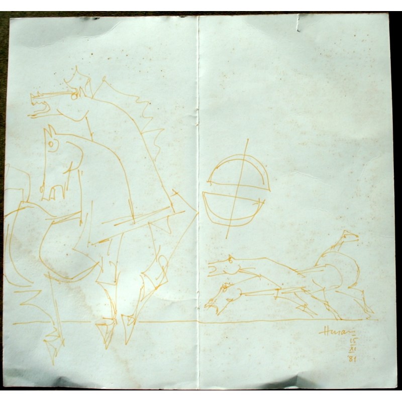 Signed and dated Husain/15/XI/81, orange fibretip pen drawn on a British Airways First Class menu cover, unframed