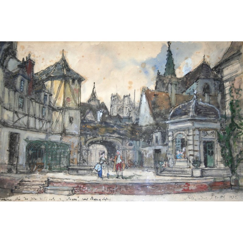 Signed and dated 1930, inscribed premiere idee du decor du 1er acte de `Manon` pour Buenos Ayres [sic], watercolour with pen and ink