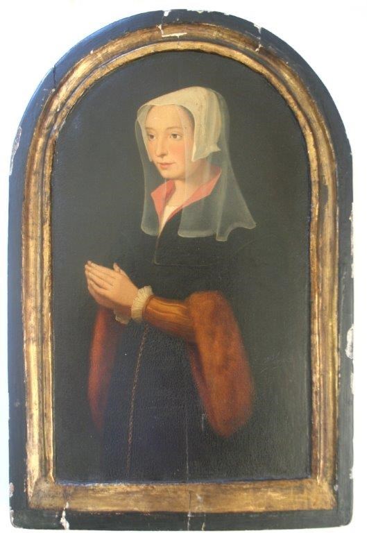 MANNER OF GERARD DAVID (c.1460-1523) PORTRAIT OF LADY Standing, her hands held in prayer, in the pose of a donor, oil on panel within an integral frame, arched top Image 32.5 x 19.5cm.