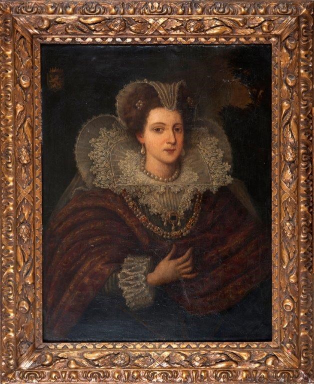 Half length, wearing a bejewelled dress with an elaborate lace collar, crest upper left (Habsburg?), oil on canvas