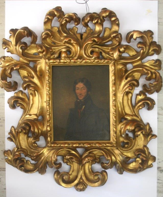Quarter length, wearing a dark coat and waistcoat, signed with monogram, also signed indistinctly and inscribed verso and with date November 1829, oil on board, within a pierced and scrolled giltwood Florentine frame with the label of Fratelli Pacetti