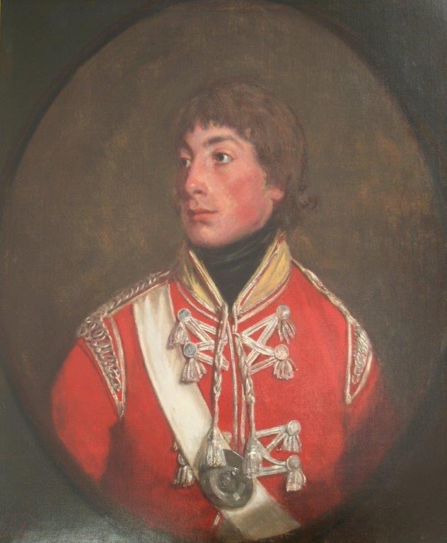 Quarter length, wearing a red cavalry tunic with white crossbelt and bullion braid, signed and dated 1796, within a painted oval, oil on canvas