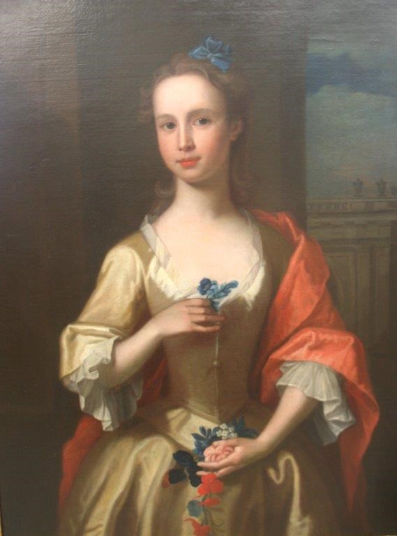 CIRCLE OF BARTHOLOMEW DANDRIDGE (1691- c.1755) PORTRAIT OF A GIRL Standing, long half length in a colonnade, wearing a yellow dress with a red mantle, holding flowers, oil on canvas 89 x 69cm.