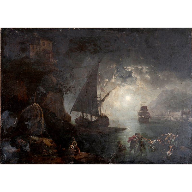 FOLLOWER OF ADRIEN MANGLARD (1695-1760) VESSELS IN A MOONLIT ESTUARY, FIGURES IN THE FOREGROUND Oil on canvas, unframed 97.5 x 136.cm.