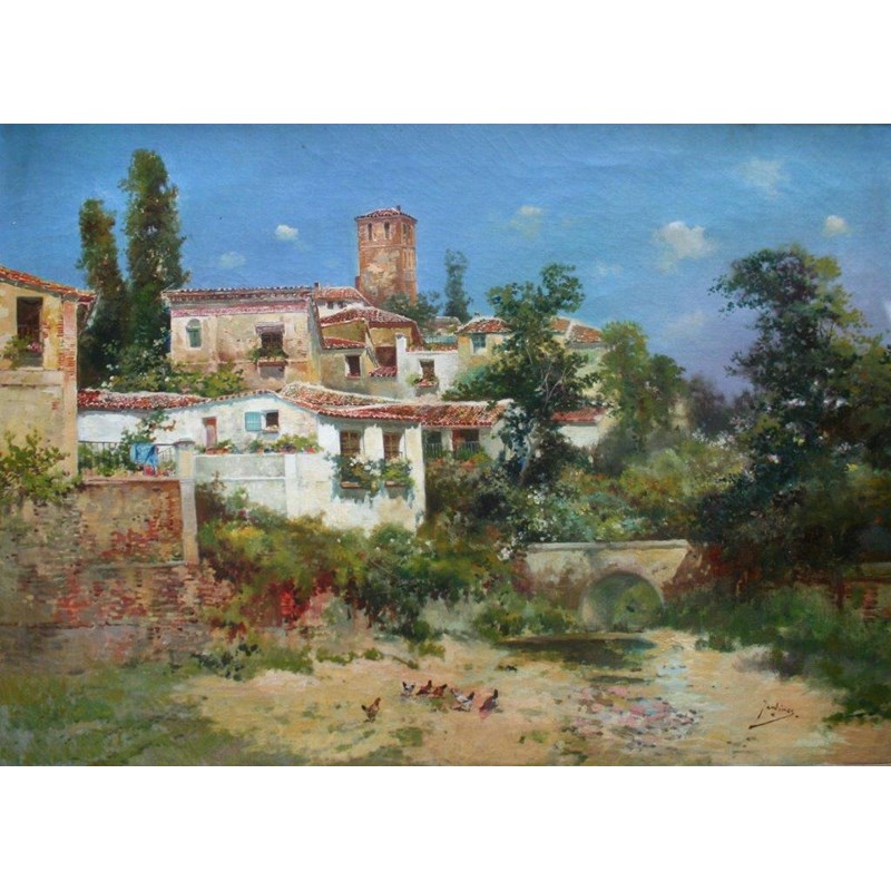 JOSE MARIA JARDINES (1862-1914) IN A SPANISH VILLAGE Signed, oil on canvas 64.5 x 91.5cm.