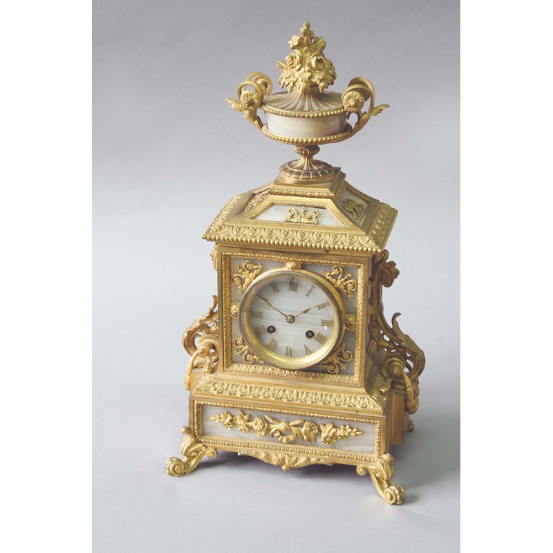 AN ORMOLU MOUNTED ALABASTER SET MANTEL CLOCK
