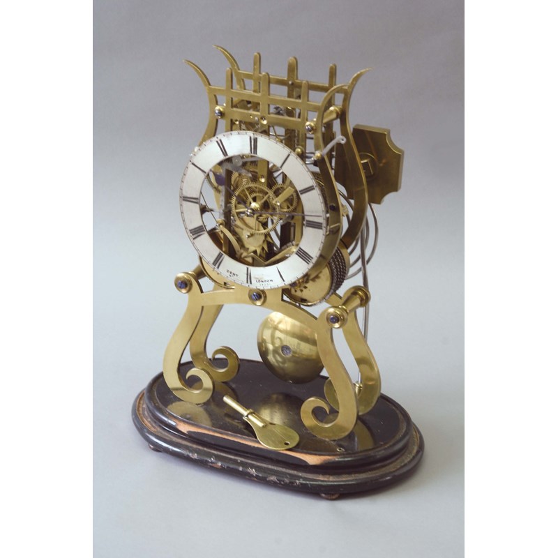 London, No. 23251, movement chain fusee striking on a gong, pull repeat, the pierced plates of lyre shape, 13 1/4ins. (33.5cms.) high. Glass dome together with a wooden travelling case applied with railway tickets