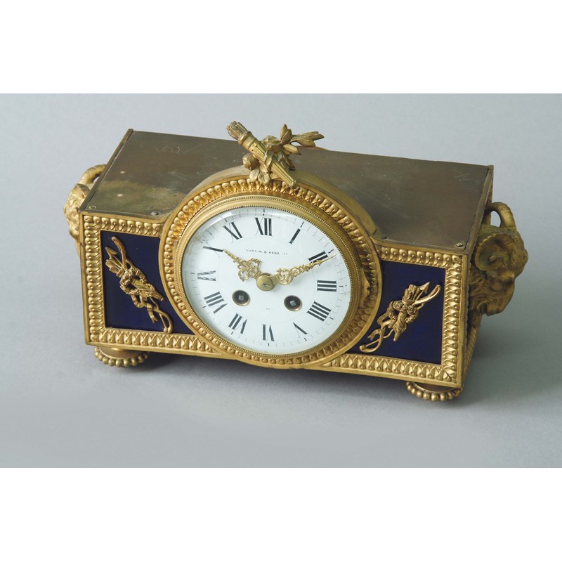 AN ORMOLU MANTEL CLOCK of Louis XVI inspiration, dial white enamel, signed Mappin & Webb Ltd., movement drum striking on a bell, case set with bleu de roi panels, the sides with bold rams masks, 6 3/4ins. (17cms.) high