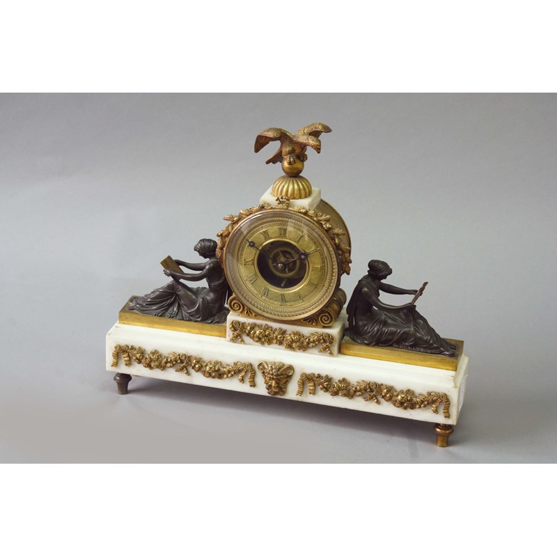 A BRONZE ORMOLU AND WHITE MARBLE MANTEL TIMEPIECE dial gilt metal with exposed wheels, case the drum surmounted by a displaying eagle and flanked by two seated classical ladies reading, 11 3/4ins. (30cms.) high