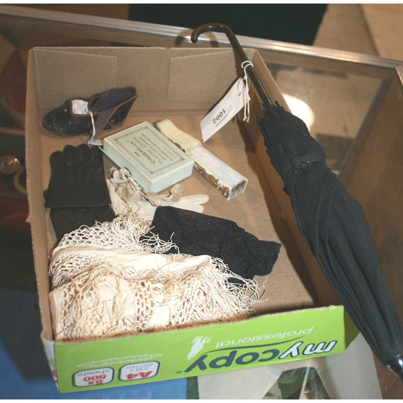 DOLLS ACCESSORIES including a Victorian dolls umbrella, silk dolls gloves, dolls silk shawl, 1 leather Jumeau shoe etc.
