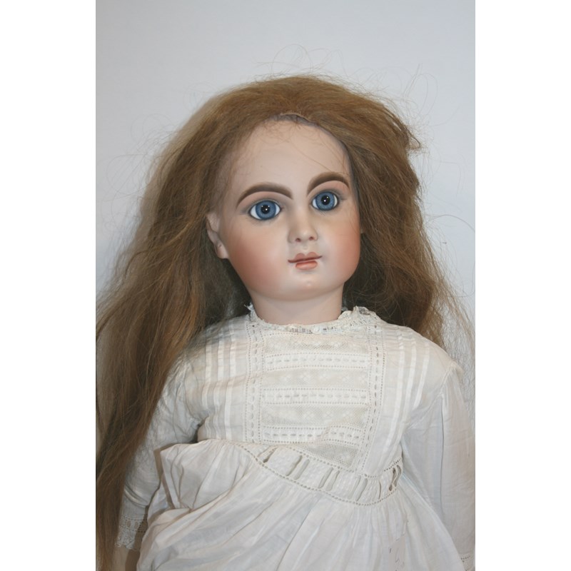 a reproduction bisque head doll in the manner of Jumeau, with fixed blue eyes, closed mouth and pierced ears. Marked, BST, 1992. 28ins (71cms) high