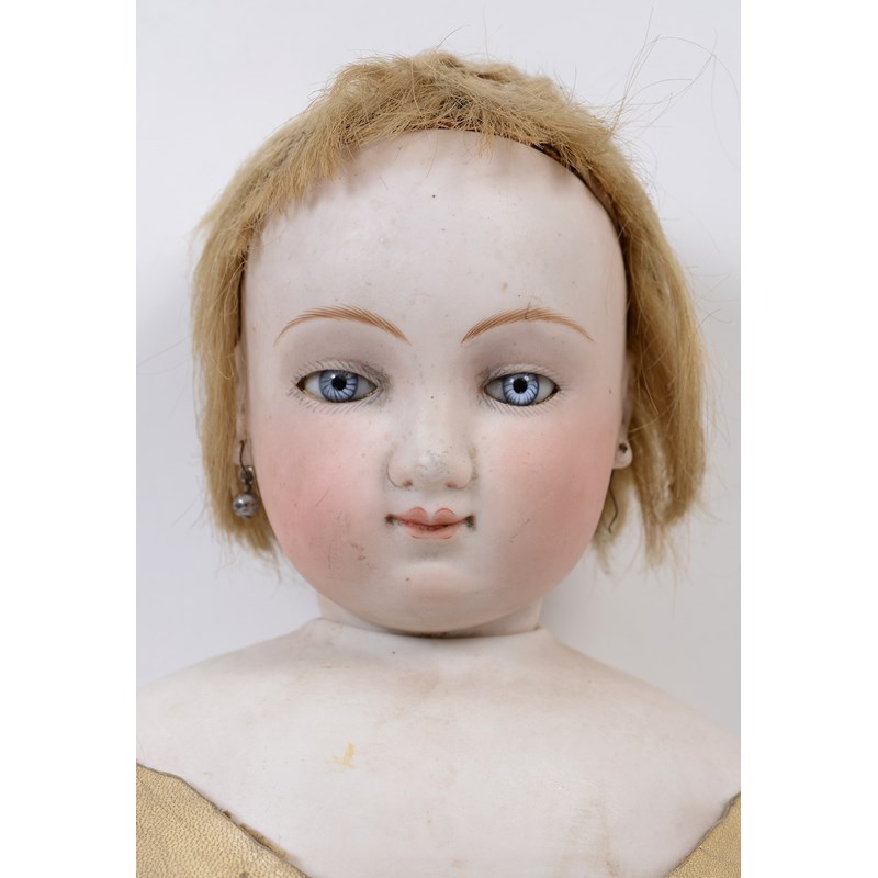 a rare Parisienne lady doll possibly by Huret. Circa 1860/70's, with a bisque swivel head and shoulder plate, fixed blue eyes, closed mouth and pierced ears. With a kid leather gusseted body and separate stitched fingers and toes. Incised mark on the front of the shoulder plate, Depose, 2 B. 26ins (66cms) high