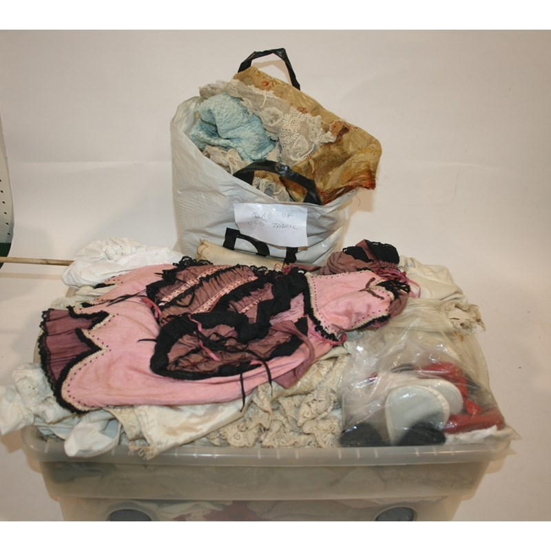 DOLLS CLOTHING a variety of vintage dolls clothing, also with some Dolls shoes and a qty of material suitable for clothing.