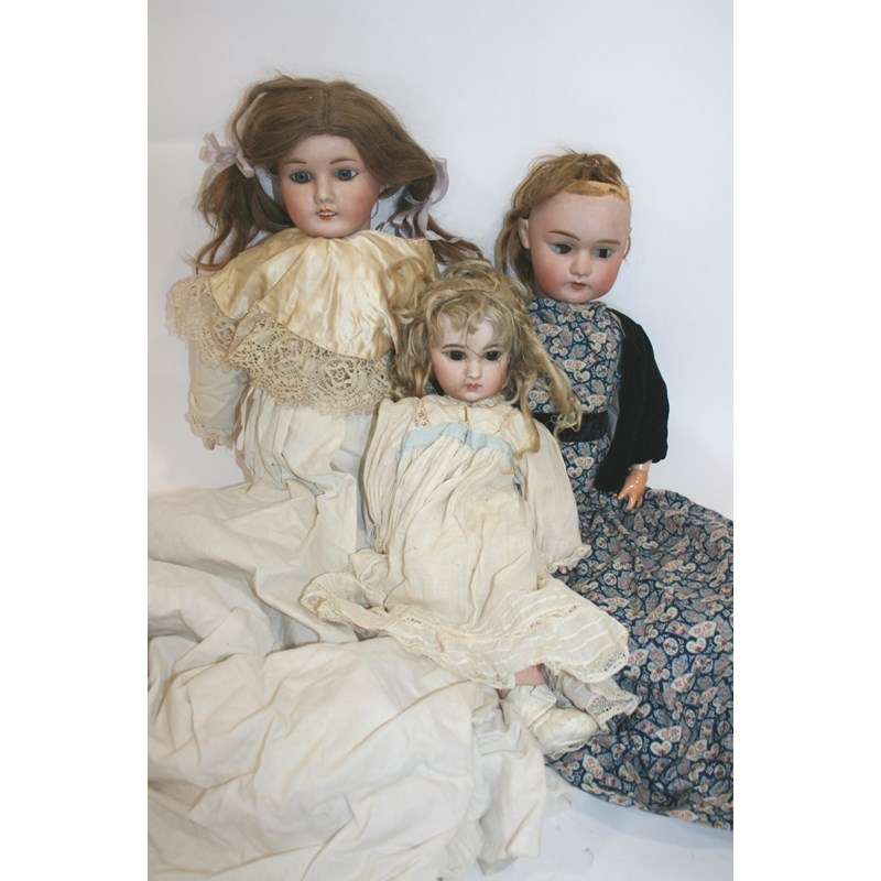 possibly by Limoges, with fixed blue eyes, open mouth and pierced ears. Also with a German bisque head doll (eyes missing), another bisque head doll (damaged), and a variety of dolls clothing. French doll marked, France, 8. 19ins (49cms) high