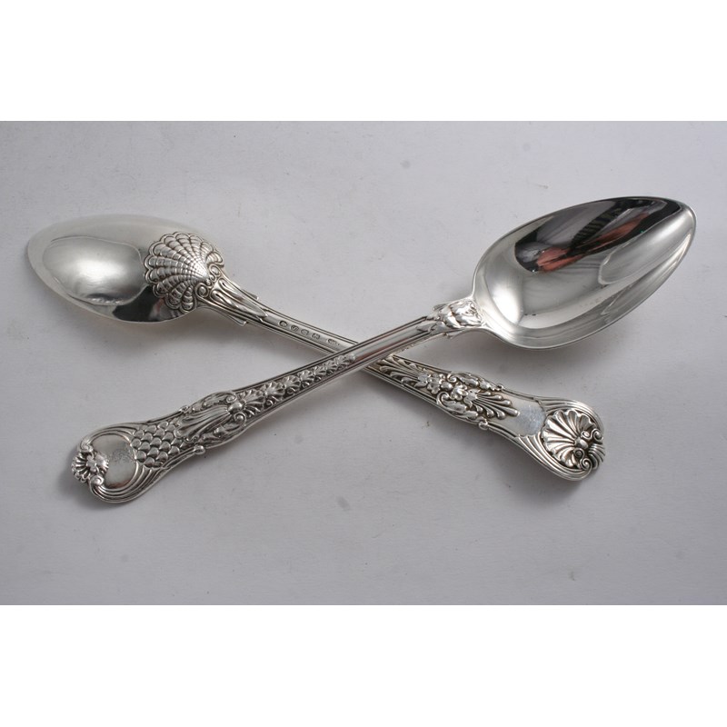 BY PAUL STORR: A pair of George III Coburg pattern table spoons, crested, London 1813; 7.3 oz (2)