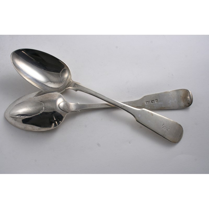 A PAIR OF SCOTTISH PROVINCIAL TABLE SPOONS Fiddle pattern, initialled, by Robert Naughton, Inverness (RN, cornucopia, thistle) 1840-60; 4.4 oz (2)