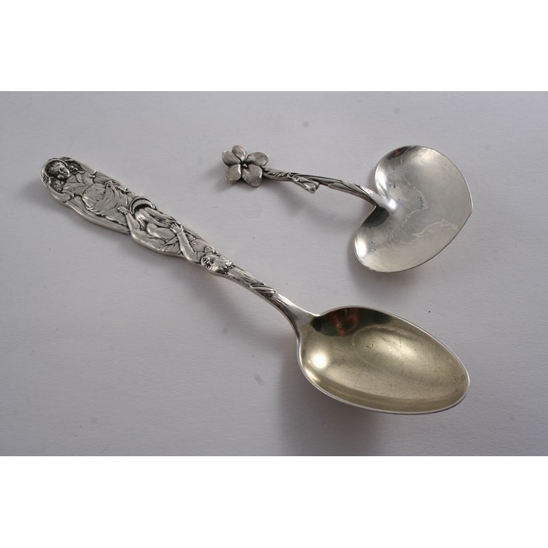 A late 19th / early 20th century American child's spoon with a gilt bowl & Jack & Jill in relief on the stem, and a caddy spoon with a heart-shaped bowl & flower terminal; the former 6.3" (16.2 cms) long; 2.1 oz (2)