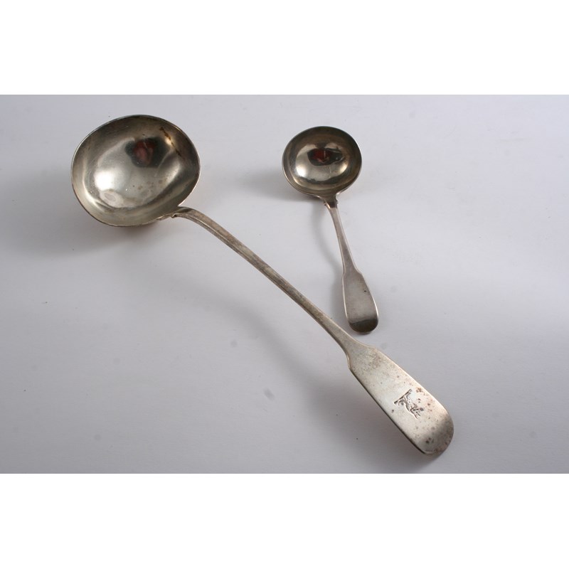 by Messrs. Eley, Fearn & Chawner, London 1810*, & a soup ladle, same pattern, crested, by William Eaton, London 1830; the latter 13" (33 cms) long; 8.5 oz (2)
