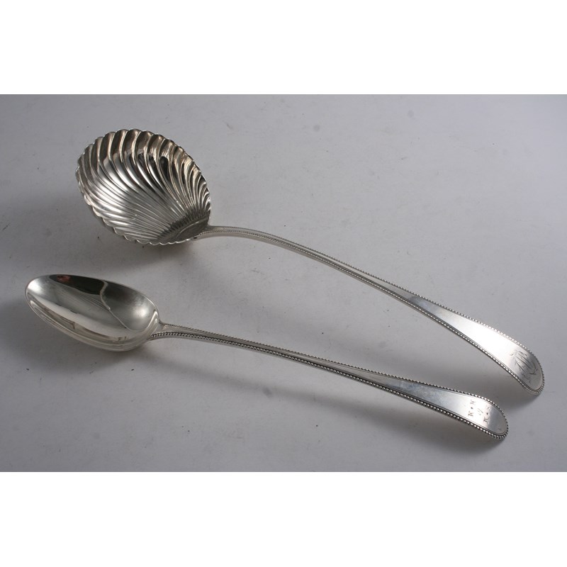 with a swirl-fluted bowl, initialled, possibly by either James Stamp or John Scofield, London 1778 and a basting spoon, same pattern, initialled "SM to MM", by Thomas Chawner, London 1776; the latter 11.75" (30 cms) long; 8.25 oz (2)