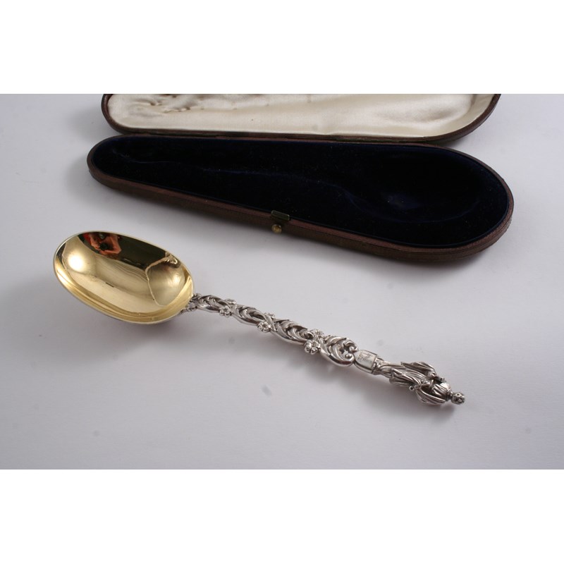 with a St. Peter apostle terminal & a gilt bowl, crested, by Francis Higgins, London 1858 (original fitted case); 7.75" (19.7 cms) long; 2.6 oz